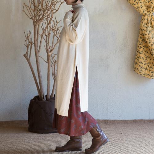 重ね着は防寒のためだけでは、ありません。 寒い冬も重ねることで、おしゃれを楽しんでいただきたい。 そんな思いから生まれたニットワンピースです。 立体感のある編立から生まれる、暖かでゆったりとした着心地も魅力です。