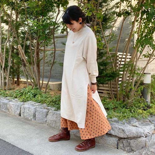 程よいハイネックや、ふっくらした袖が大人っぽい印象なので、スリットから見せるボトムスは可愛い柄を見せると程よいバランスに。(155cm)