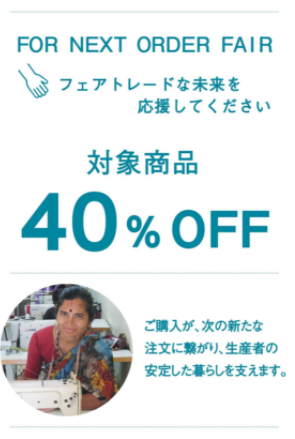 販促や今季の在庫消化を目指したいという方のために、SALE用のPOPを作成しました。 SALEという直接的な言葉ではなく、『For Next Order Fair』=生産者への次のオーダーに向けて、という表現をすることで、単なる安売りではなく、意味のあるSALEという位置づけで表現しています。ぜひご活用ください。