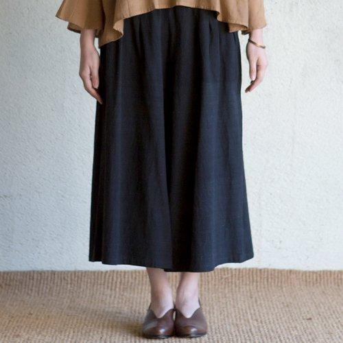 時代を超えて愛されているパトムのロングセラー、タックワイドパンツ。ゆったりはけて、動きやすい。全部で16本の手で畳んだタックがタテのラインを強調して、スマートなシルエットに。ゆったりした着心地なので寒い冬は中にレッグウォマーやレギンスなどの重ね着もOK。中厚のコットンブラック生地はシックにも、カジュアルにもシーンを問わず活躍する一枚は持っておきたいアイテム。 ウエストはゴム仕様。両脇ポケット付。