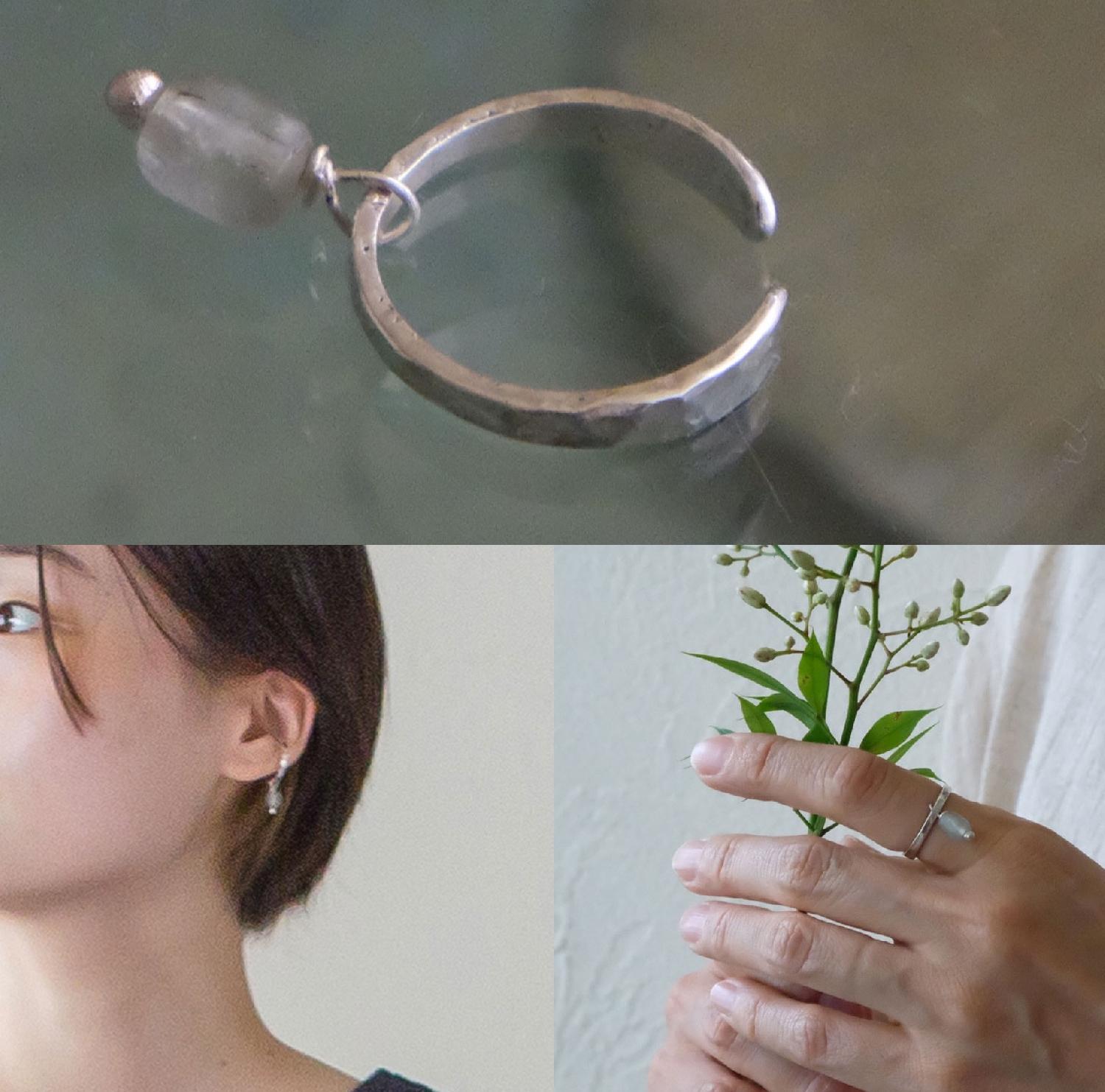 リサイクルガラスのビーズをあしらった イヤーカフ。 小さな小さなシルバーの粒が、まるでシズクのように滴るデザインです。 動くたびに心地よく揺れるモチーフ。 顔周りに、ひとさじの輝きが差し込みます。 実はフリーリングとしても楽しめるんです。 手元で揺れるビーズも可愛いですね。 シーンに合わせて、 お好きな見せ方をお選びください。