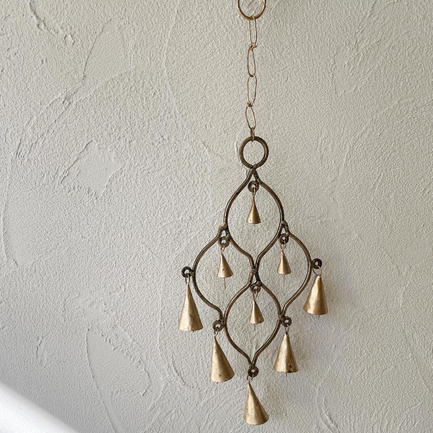 大小サイズが異なるとんがり三角のベルを、ひし形に並べたハンギングベル。 オリエンタルな雰囲気が目を引きます。 風が通る場所に吊るしたり、ドアチャイムに使用されるなどして、心地よい音色をお楽しみください♪