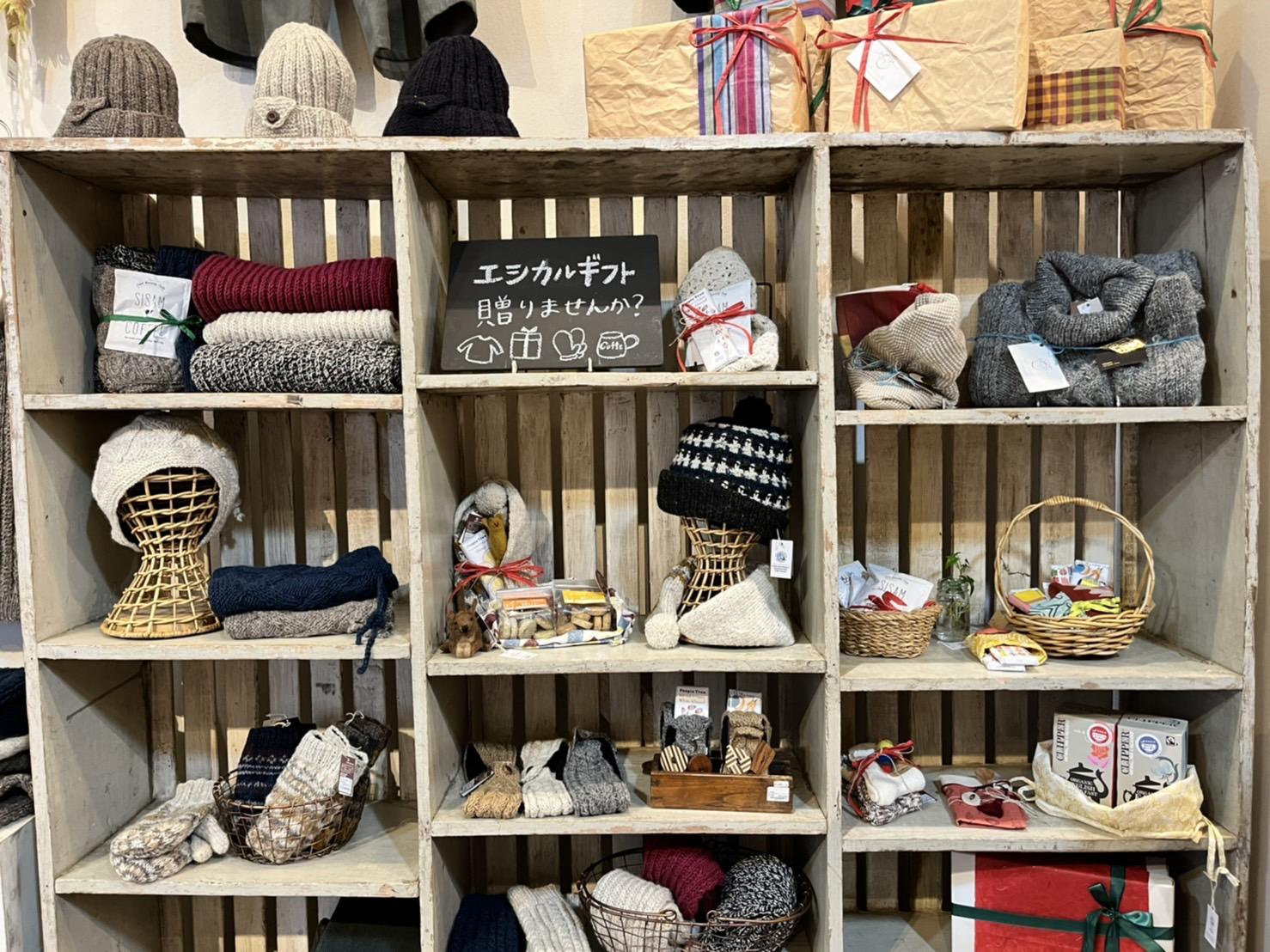 シサムの直営店でも「エシカルギフト」フェアトレードアイテムを使ったギフトをディスプレイに取り込むことでギフト探しのお客様もイメージがつきやすく、ご購入に繋がりやすくなっています◎