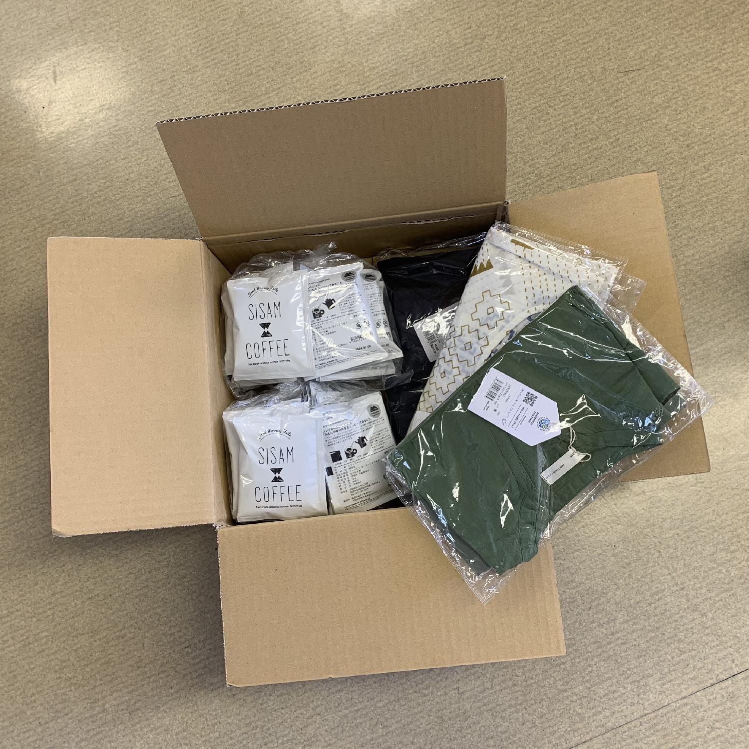 これまではコーヒーや割れ物であるneemカトラリーや陶器などはスモールパック対象外でしたが、今回からは80cmまでのサイズに収まれば発送可能となりました。 下記に下代税抜¥20,000のご注文目安をご紹介します!!