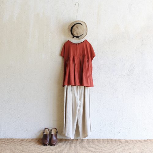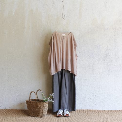 今季イチオシのSisam Organicのチュニックに、ハリのあるタイプライター生地のワイドパンツを合わせた