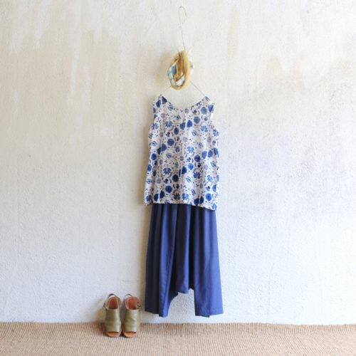 頭にスリムショールを軽やかに巻いて、ボトムには変形パンツを合わせて見た目も涼しく、暑い夏を心から楽しく過ごすコーディネートに。