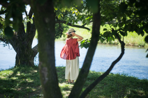 深みのあるスラブ生地の赤色は、陽射しのまぶしい季節に咲いた一輪の花のよう。