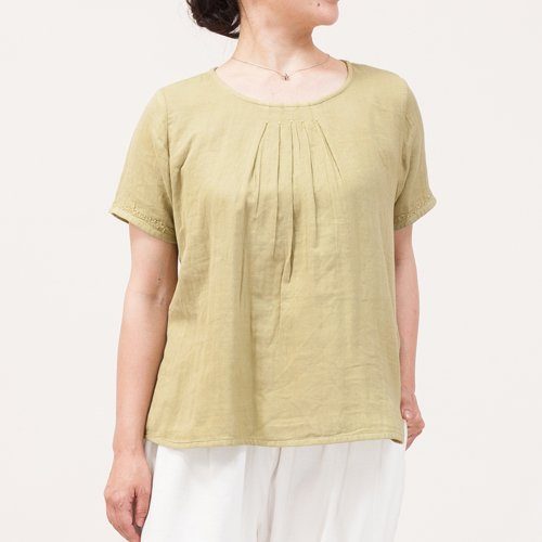 首元から並んだ小さなタックで生地に立体感を出しています。