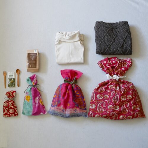 リサイクルサリーや暮らしで使われていた布が、ラッピングとして生まれ変わりました。