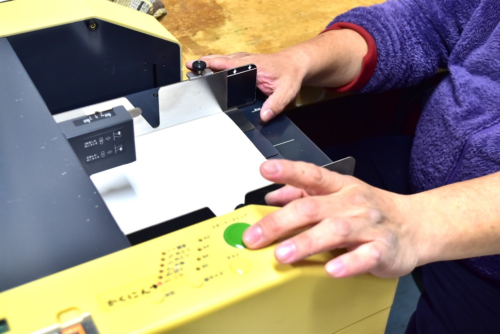 ③平らに加工した点字用紙を折り機にかけ、封筒サイズに折ります。