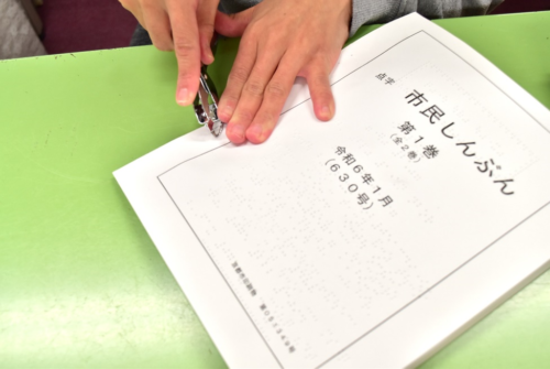 ①ホッチキスを外したりして、点字新聞を解体。