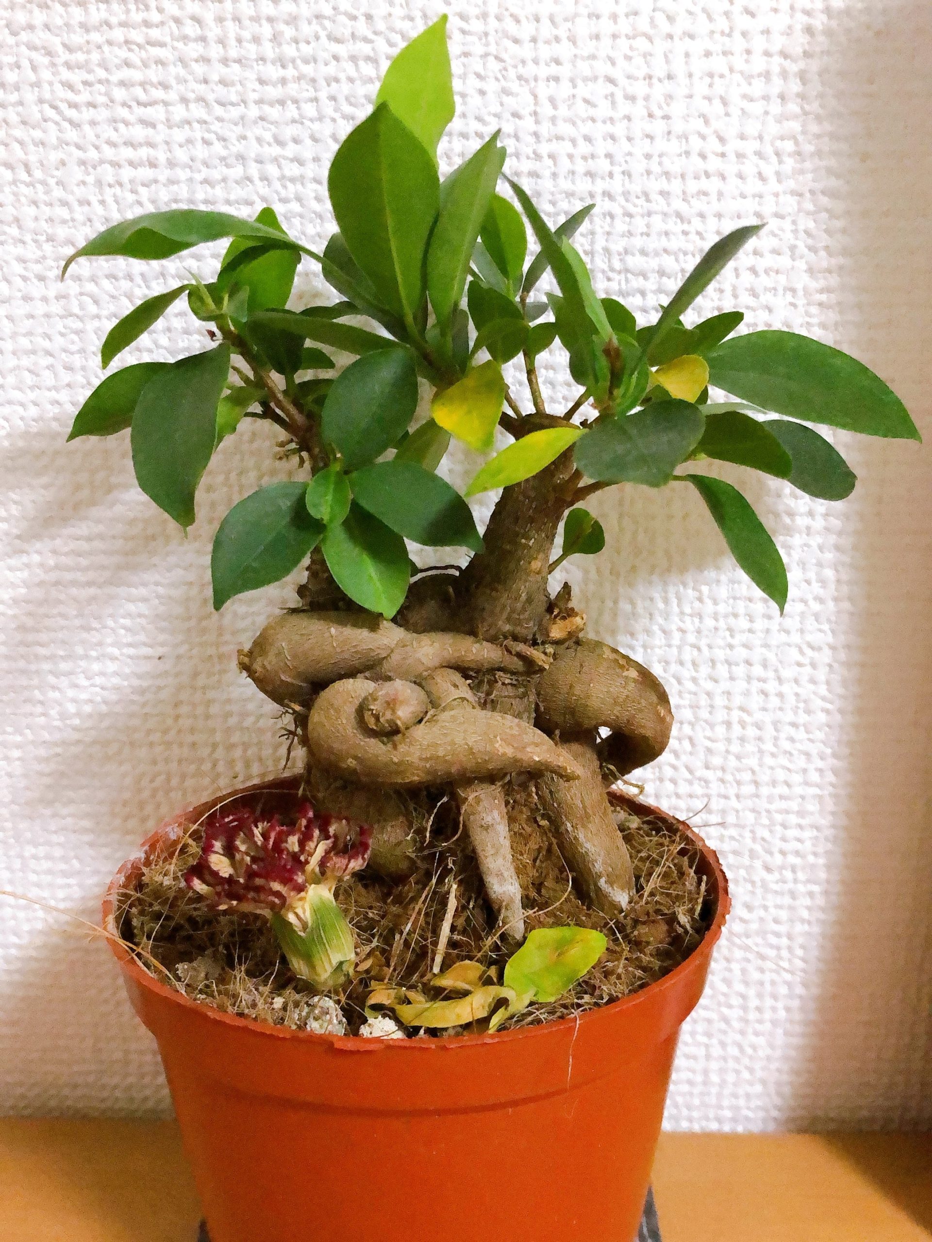 ガジュマルは通称「幸せを呼ぶ木」。毎日、日向に置いて日光浴させてます。