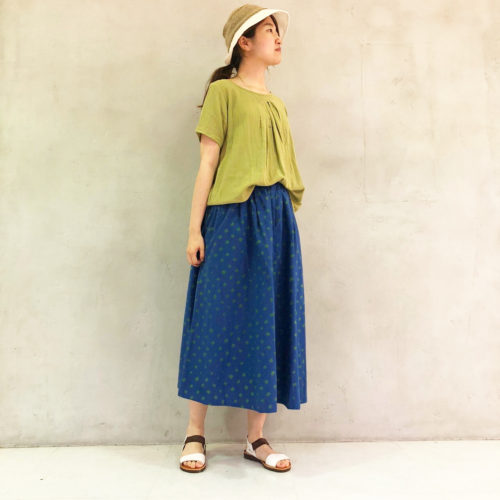 くすんだライトグリーンで、柄のスカートも大人っぽく引き立ててくれます。
