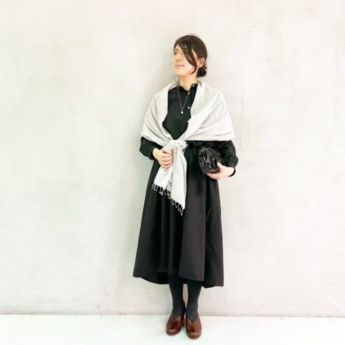 シュシュをショール留めにして、上品な色合わせに。