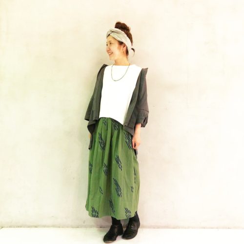 初夏の日差しに映える、グリーンのスカートを主役に。