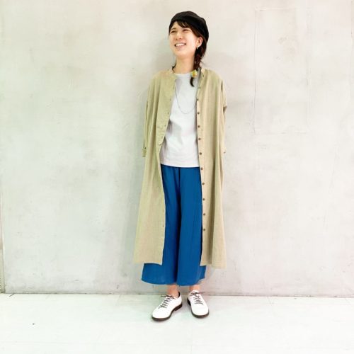 羽織りのヘンプコットンのシャツワンピが印象をやわらげます。