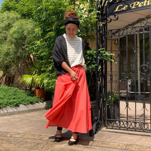 【鮮やかオレンジのスカートでウキウキコーデ】