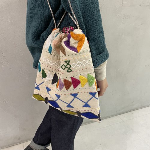 手仕事の物語がたくさん詰め込まれた、スザニの巾着バッグ。