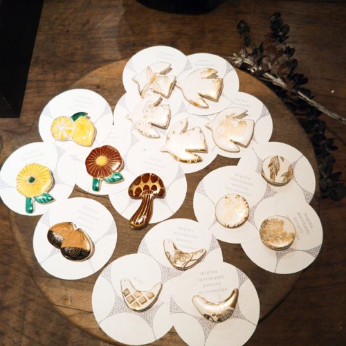 京都在住の元橋みぎわさんによる陶器・金彩ブローチ。