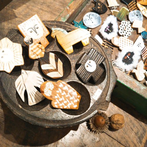 陶器や木、真鍮など様々な素材のブローチ、