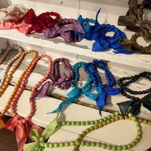 お腹の前で結んでも使えるアレンジ自由自在のシルクボールネックレス。