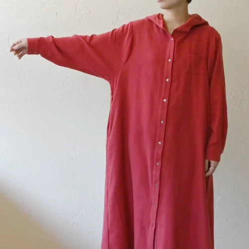 落ち感がある生地を生かした、Aラインのフードつきワンピース。