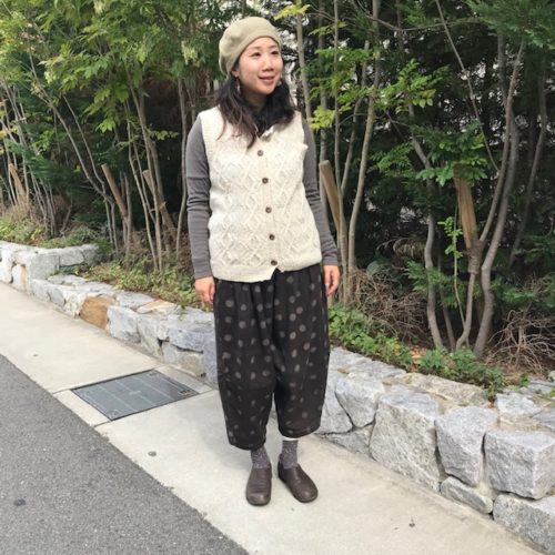 手編みのニットと合わせたり、中にレギンスを入れて重ね着すると、冬のよそおいとしても活躍する一本です。