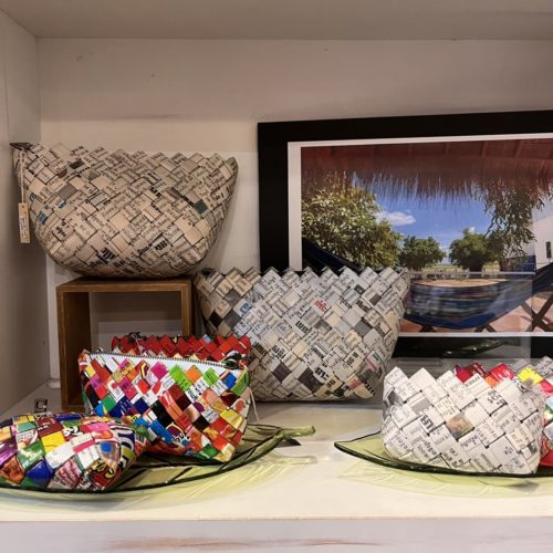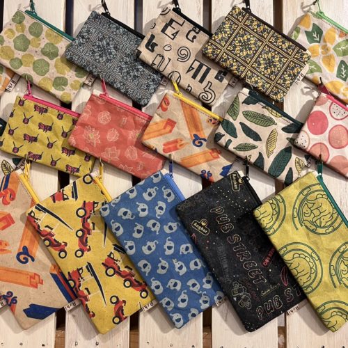 小学校で子どもたちが食べた後のお菓子袋、そしてカンボジア語の古新聞を再利用してポーチやバッグ、コインケースなどを製作しています。