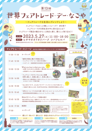 5月27日(土)に開催される「第13回 世界フェアトレード・デー・なごや」にて、代表 水野がお話させていただきます。クイズも出題します!