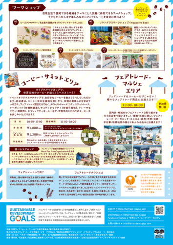 国内外・地域内のフェアトレードの取組をしている出展者で賑わう「フェアトレードマルシェ」や、コーヒーの飲み比べが楽しい「コーヒーサミット」、ステージイベント、ワークショップ、スタンプラリーや抽選会など、もりだくさんの1日です。ぜひお越しください!