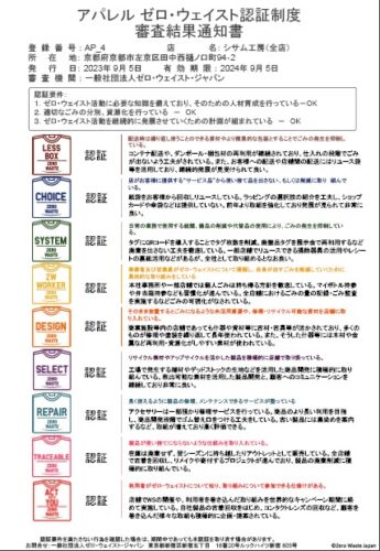 アパレルゼロ・ウェイスト認証、この度、まさに本日、全9項目にて認証されました!!