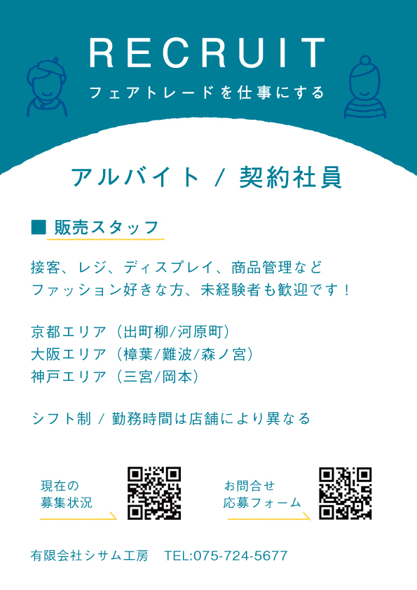 シサム工房では、小売り販売スタッフを募集しております。