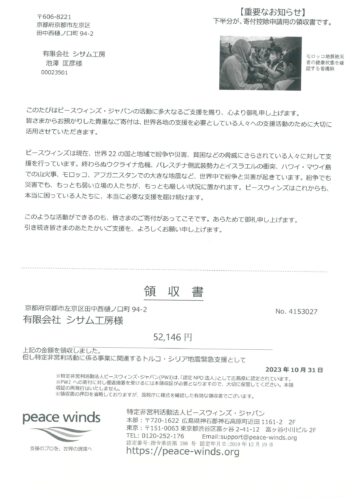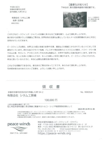 ・ピースウィンズジャパン(店頭募金: トルコ・シリア地震) 3,134円