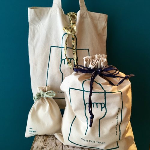 インドのNGO・Creative Handicraftsが作る巾着とバッグ。
