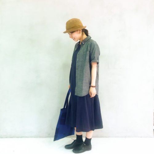 かわいい印象のワンピースに、ややビックサイズのメンズシャツと、ハットでピリリと辛みを。
