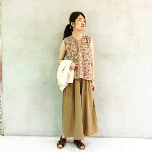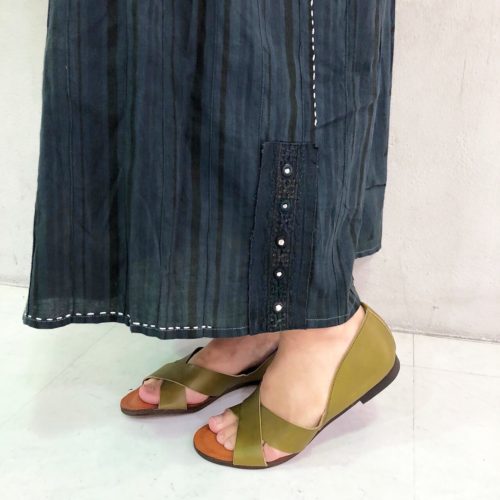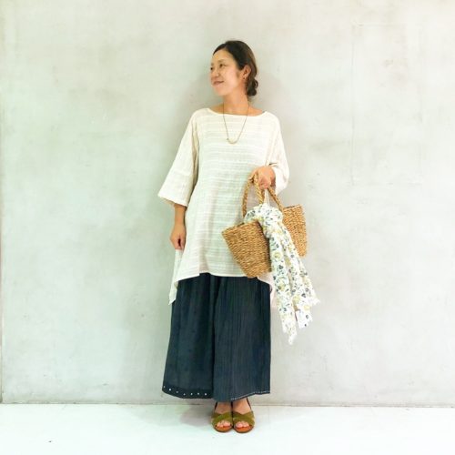 軽い生地感の藍染めスカートでさらっと見せられます。