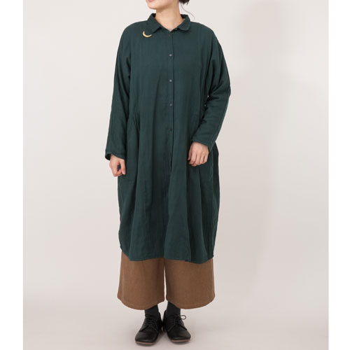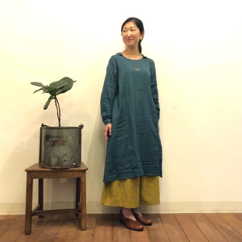 ガーゼのワンピースに柄物のワイドパンツを合わせました。
