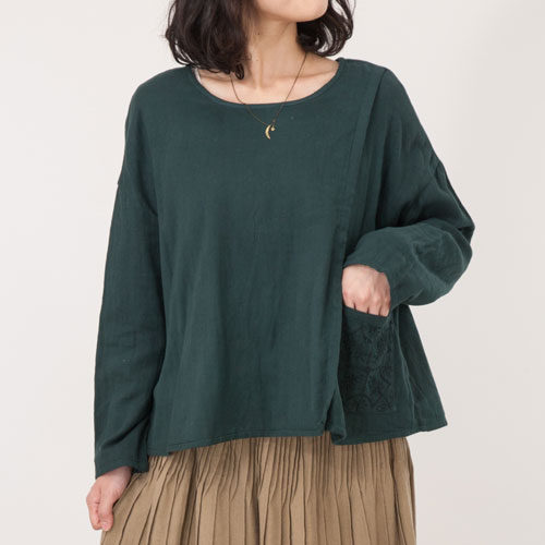背中に野の花刺繍が入ったストレスフリーのトップスです。