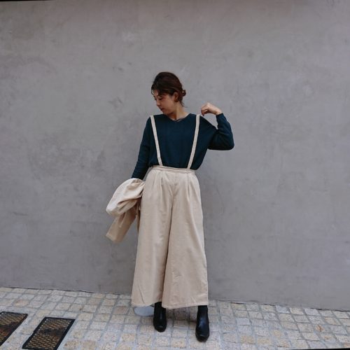 とり外し自由なサスペンダーパンツは、カジュアルからキレイめなコーディネートまで、