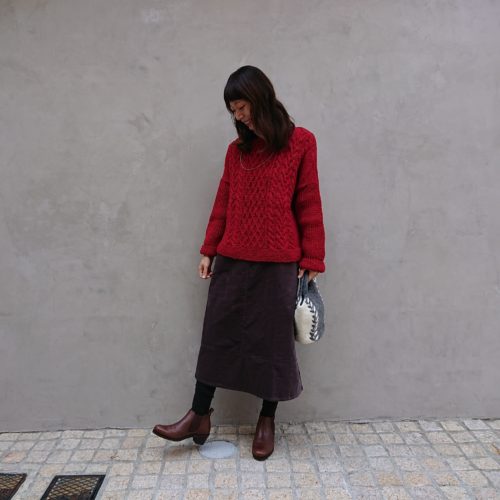 作り手の技がひかるアラン模様をたっぷりと施した手編みニット。