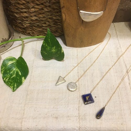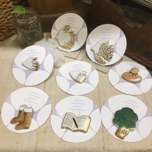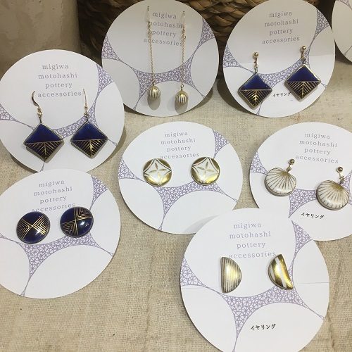 水や鳥、植物をモトーフに金彩や色絵で装飾した、細やかなアクセサリー。