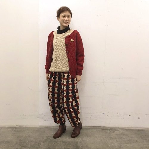 こちらは、動きやすくて、膝下で切り替えのあるサルエル風パンツ。
