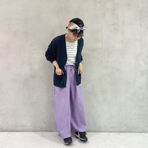 パープルが印象的なパンツは、シルエットにこだわった一本。