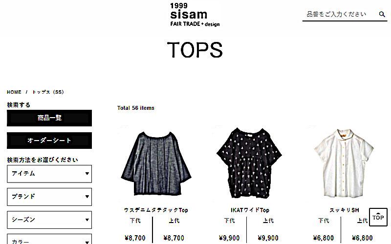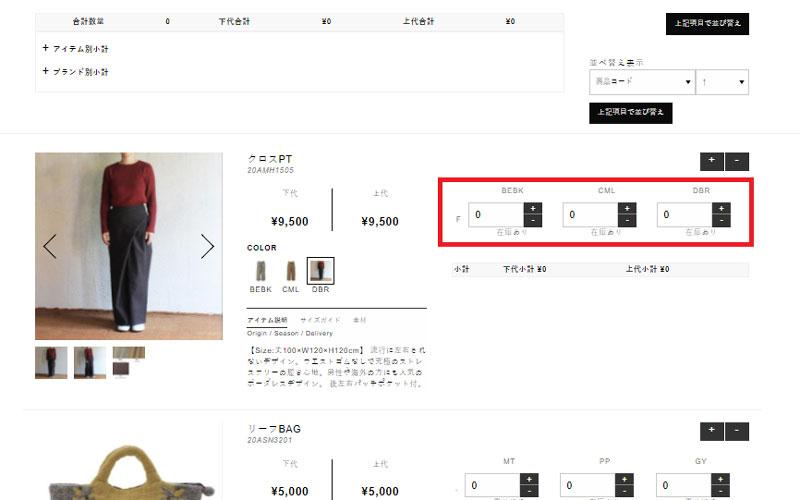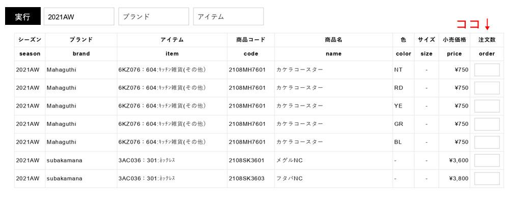 (3) すると2021AW商品が一覧で表示されます。 表の一番右にある「注文数」のところに数字を入力すると注文することができます。 商品は品番(商品コード)順に並んでいます。