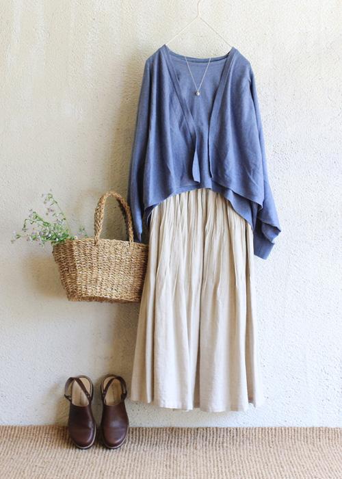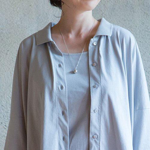 今季のSisam organicのスカイブルーは、大地に降り注ぐ前のような優しい青。ニットカーディガンとカットソーを重ねたアンサンブルがおススメ。雨のように優しい音を奏でるネックレスを重ねて。
