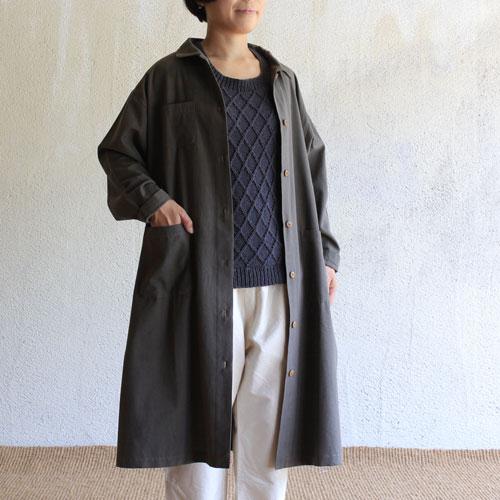 寒暖差の大きい春には重ね着を。 ワンピースをコート風に羽織って、インナーを見せる事で、縦のラインが強調され、着やせ効果も期待できます。インナーに重ねたベストの編み模様も一層浮き立ちます。