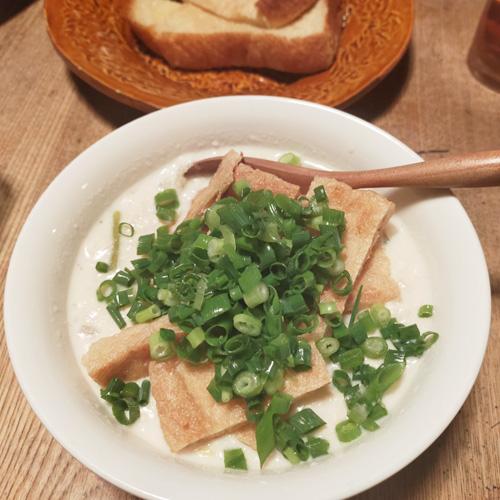 温めた豆乳に少量の酢を加えると、ゆるくところどころに豆乳が固まって何とも優しい口当たりになります。味付けはザーサイや干しエビを入れたりするレシピもありますが、今回はなべ焼きうどんをアレンジしてお出汁ベースで。