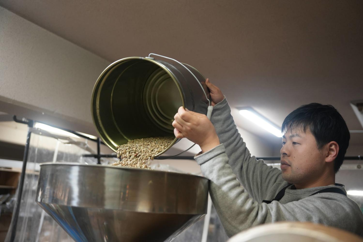 予め不純物や欠点豆を取り除いた生豆を焙煎機に流し込む