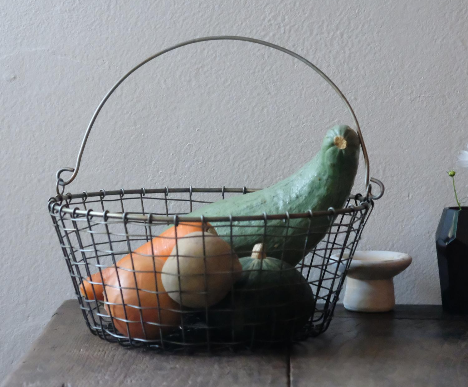 野菜や果物を入れたり、お気に入りの小物などのいれものに、持ち手付きなので、天井から吊るしても素敵です。色はアンティークシルバー仕上げ。