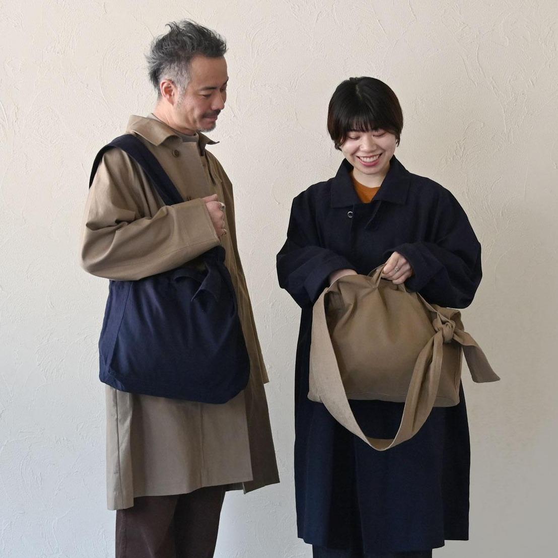 結ぶ位置によって長さを調整できる肩紐、手提げとしても使えるサイドハンドルがついた
